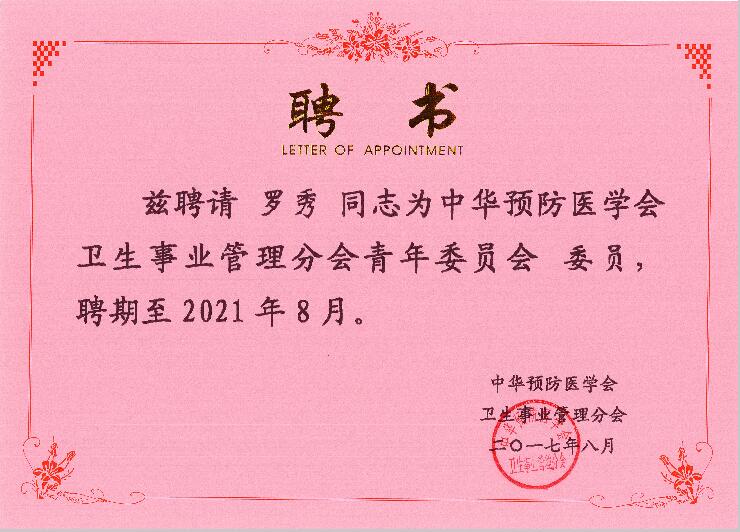 会议期间召开了中华预防医学会卫生事业管理分会常委会会议和第二届青年委员会第一次会议,我系罗秀副教授受聘为中华预防医学会卫生事业管理分会第二届青年委员会委员。