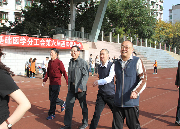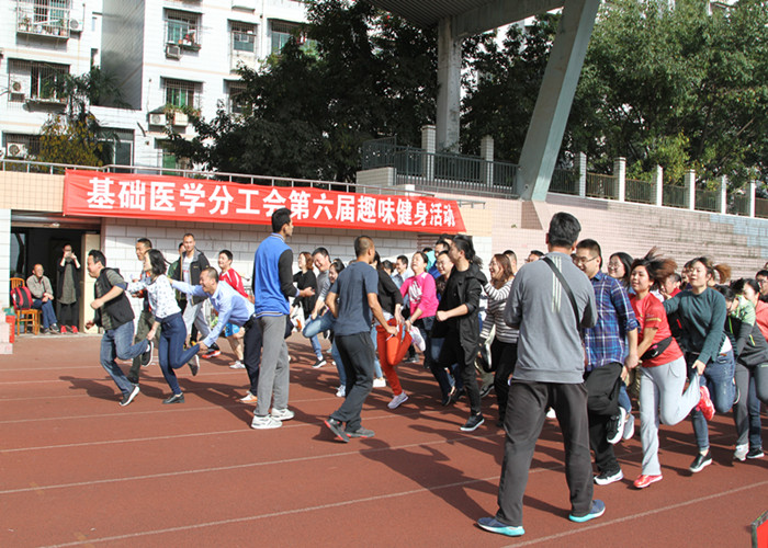 基础医学分工会由基础医学院、药学院、预防医学系、法医学系及形态学和分子生物学研究所6个部门组成。来自各部门的教职工200余人,分为七个参赛队伍(虎啸队、喜洋洋队、友谊队、快乐队、雄鹰队、山鹰队、灰太狼队)参加了包括齐心协力、双人背球接力赛、袋鼠赛跑、健步走、火车赛跑、赶球等七个项目的趣味活动。