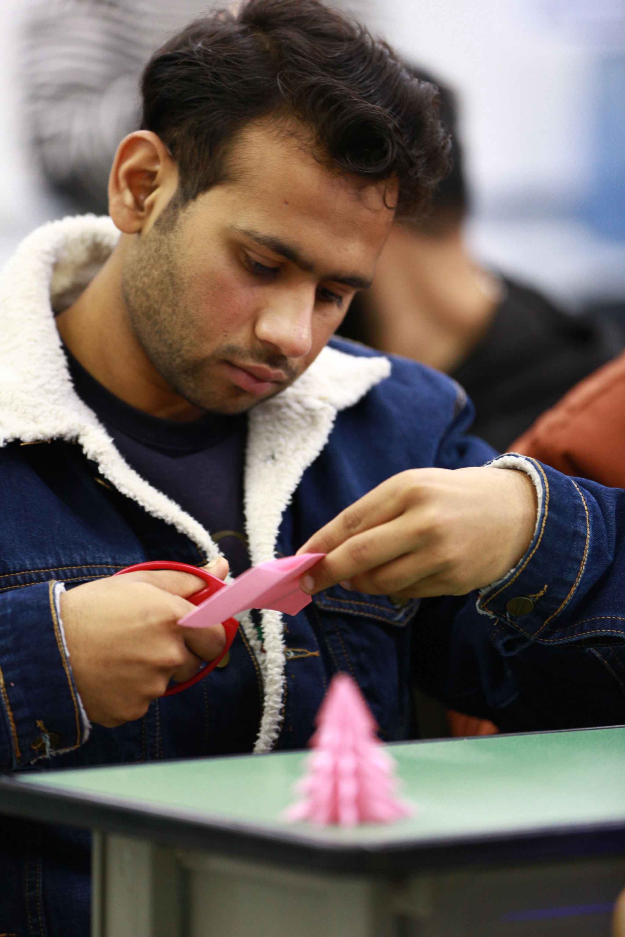 来自四川省南充市仪陇县的省级非物质文化遗产代表性传承人和工艺美术大师何小锵老师是本期校外导师。他从代表太阳的圆、代表月亮的月牙和代表山的曲线开始一步步教留学生怎样运用剪刀,再教同学们剪葫芦、蝴蝶……