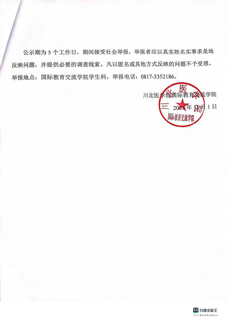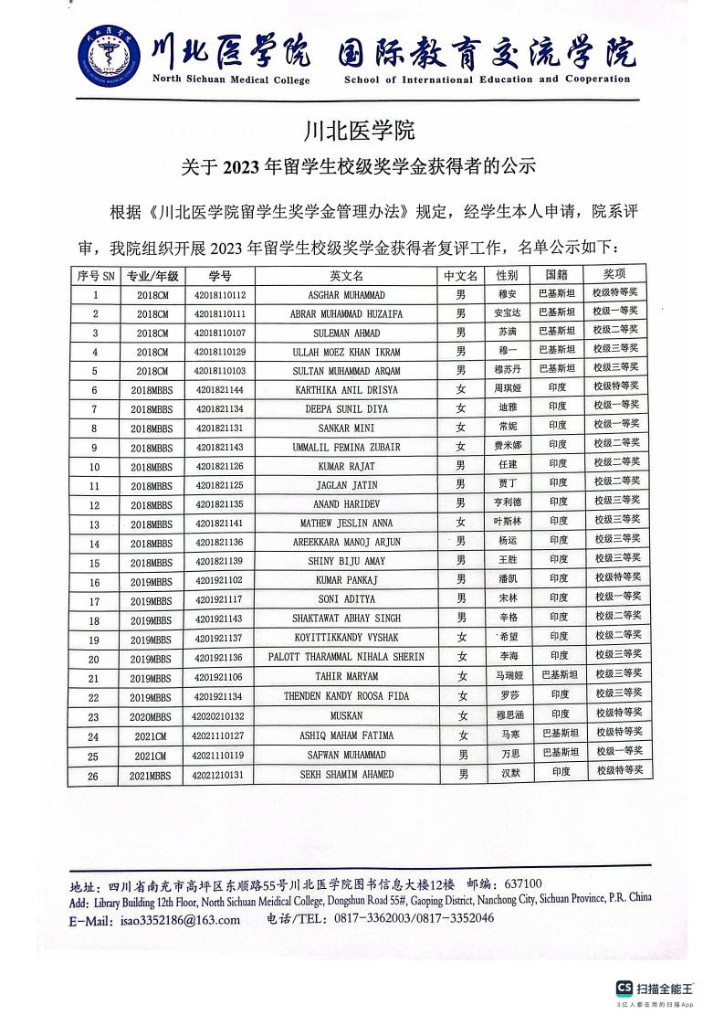 川北医学院 关于2023年留学生校级奖学金获得者的公示