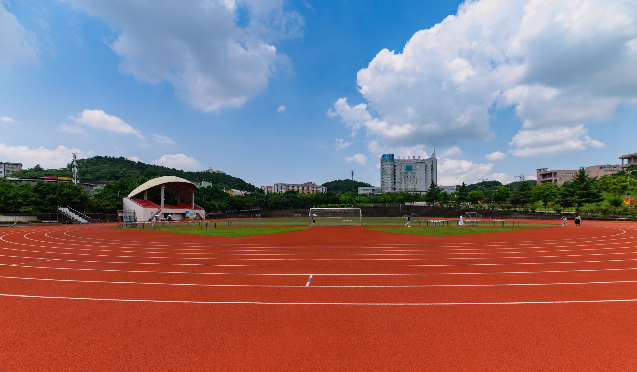 田径运动场里有足球场和橡胶跑道,跑道周围还有阶梯式的观赛区,每年的足球比赛、运动会和军训汇演等都在这里举行。