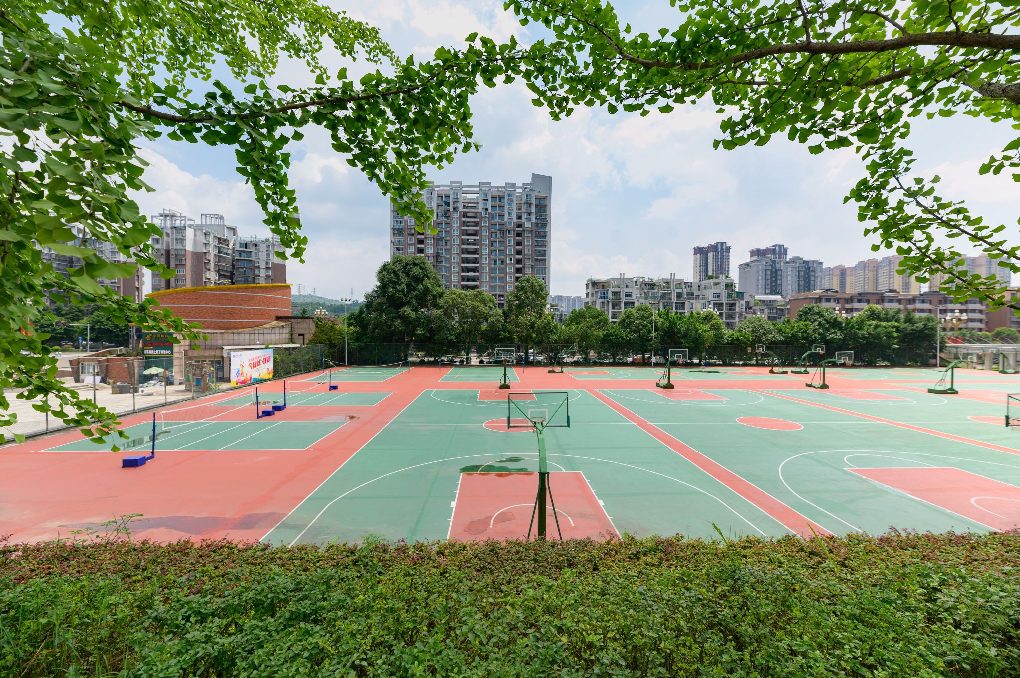 篮球场位于校大门口右侧,地面刷上红绿配色的地坪漆,有效防止打滑。热爱打篮球的同学们相约于此开展一场场激烈的运动竞技。