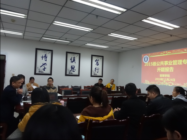 开题报告是学位论文工作的重要环节,是保障和提升学位论文质量的有力措施。11月24日上午,我院举行了2015级公共事业管理专业毕业论文开题报告会。报告会分为四个小组,分别在管理学院会议室,社工教研室,图书信息大楼304、404教室同时开展。全体指导教师参加了报告会,低年级同学进行了学习观摩。