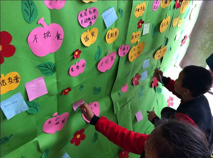 经过前期的社会工作教育对口扶贫实地调研,小分队将红色筑梦之旅第一站定在了千坵村小学。针对低年级学生存在不良行为习惯问题,策划开展了一堂充满爱与温暖的“社工课堂”。“社工筑梦”教育小分队运用社会工作专业方法开展教育扶贫服务,通过生动有趣的小游戏互动、绘声绘色的社工课堂讲解,逐渐与小朋友们建立了专业关系。主题活动“苹果树的约定”,通过社工哥哥、姐姐的帮助,小朋友们一起制定了文明班级公约,把文明小学生行为规范一条条贴在了苹果树上。通过社工哥哥姐姐的引导,小朋友们也渐渐认识到自己的不良行为习惯,并表示要努力改正,争做文明懂事的好孩子。此外,针对留守儿童孤独感和自卑感较强的特点,设置了“社工小信箱”,通过信件方式倾听他们的心事与诉说,解答他们在学业、家庭教育、交友等方面的困惑。