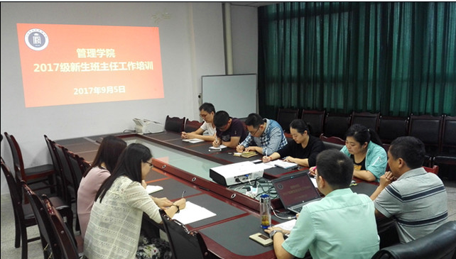 9月5日上午,我院在图书信息大楼八楼会议室召开了2017级新生班主任工作培训会。管理学院党政领导班子、辅导员及2017级新生班主任参加了本次会议,会议由管理学院党总支副书记代成书主持。