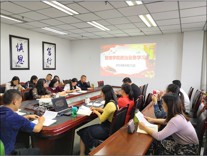 为深入推进“两学一做”常态化制度化,9月25日,管理学院党总支召开政治业务学习会,教工党支部和学生党支部在学校高坪校区图书信息楼8楼会议室先后学习了习近平总书记给中央美术学院老教授重要回信精神和习近平总书记关心关怀青年和青年工作纪实。