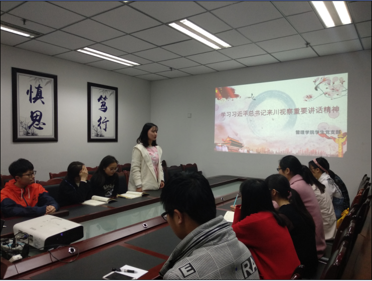 为深入学习贯彻党的十九大精神,进一步提升学生党员的党性修养,3月25日晚7:00,管理学院学生党支部于高坪校区图书信息大楼八楼会议室进行了“习近平总书记来川视察重要讲话精神”专题学习,我院全体学生党员和部分入党积极分子参加了此次活动。
