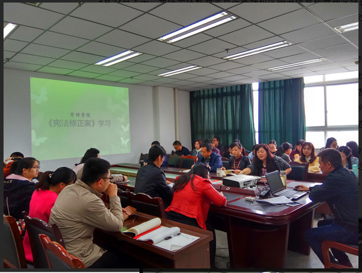 3月27日下午,我院全体教师党员在高坪校区图书信息楼管理学院会议室召开会议,集中学习了《中华人民共和国宪法修正案》。传达学习第十三届全国人民代表大会第一次会议通过的宪法修正案,会议由党支部书记麦陈耀主持。