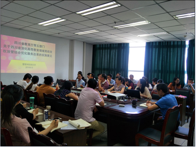 会上,人文素质教研室主任唐榆晴带领全体教师党员学习了《关于四川省深化高等教育领域简政放权放管结合优化服务改革的实施意见》,文件从完善学科专业设置,完善编制及岗位管理,完善进人用人制度,改革教师职称评聘制度,健全薪酬分配制度,规范经费使用管理,完善内部治理结构,强化监管优化服务等8个方面,对我省深化高等教育领域简政放权放管结合优化服务改革提出具体实施意见。