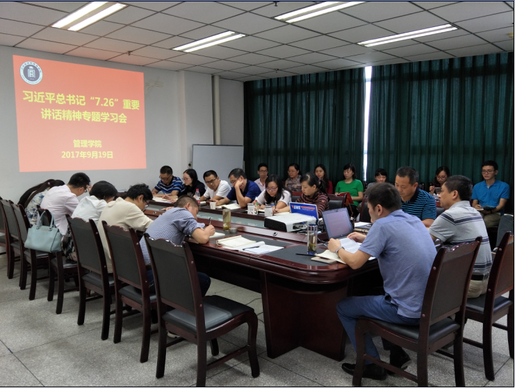 9月19日下午,我院在高坪校区图书信息楼8楼会议室召开习近平总书记“7•26”重要讲话精神专题学习会,我院全体教师参加了会议,会议由党总支副书记代成书主持。