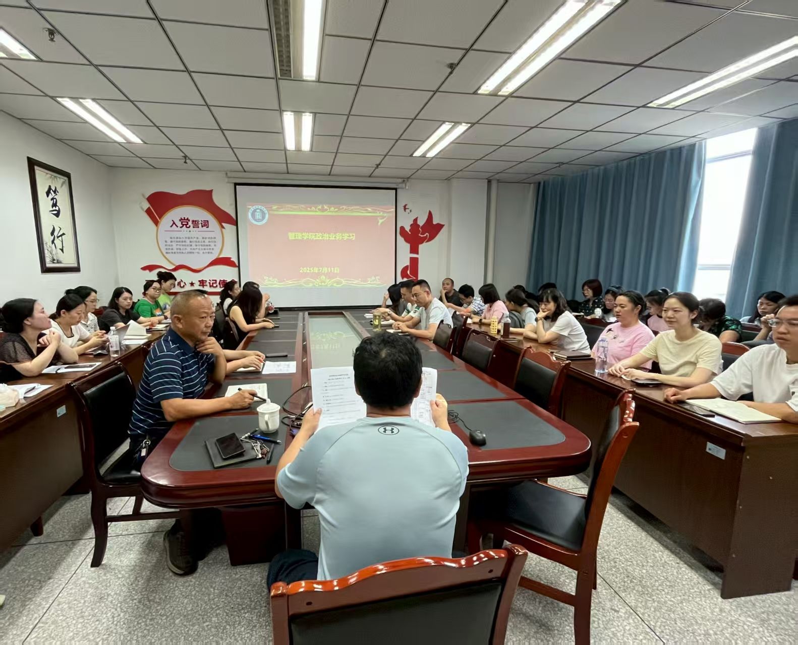7月11日上午,管理学院党总支在高坪校区图信楼八楼会议室组织开展了理论学习中心组2025年第6次集中学习(扩大)会议。本次会议由管理学院院长柯雄主持,管理学院党总支理论学习中心组成员、管理学院、MPA教育中心、四川省基层卫生事业发展研究中心全体教职工参加学习。