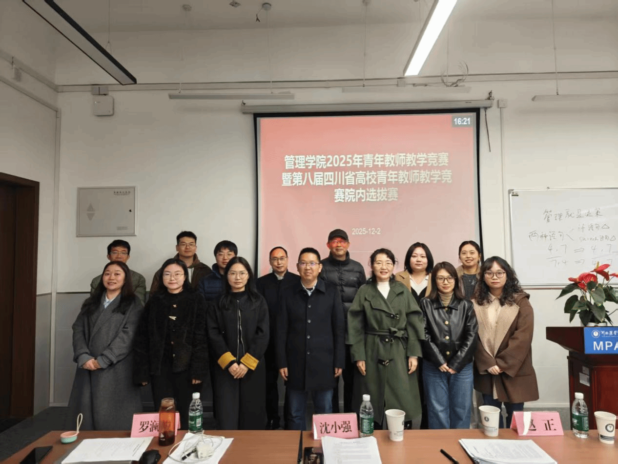 12月2日,管理学院在甘露书院南403成功举办2025年青年教师教学竞赛暨第八届四川省高校青年教师教学竞赛院内选拔赛。本次竞赛旨在“以赛促教、以赛促学”,提升青年教师教学能力,并选拔优秀教师代表学院参加校级选拔。活动由副院长胡帮勇主持,学院全体青年教师到场观摩。