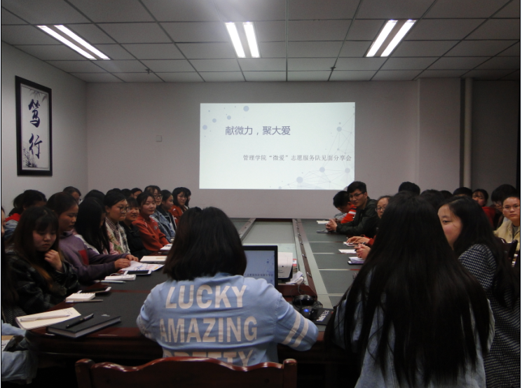 3月24日19点,由管理学院组织的“微爱”志愿服务队在图书信息大楼八楼会议室召开了第二届成员见面分享会。“微爱”志愿服务队全体成员参加此次会议。