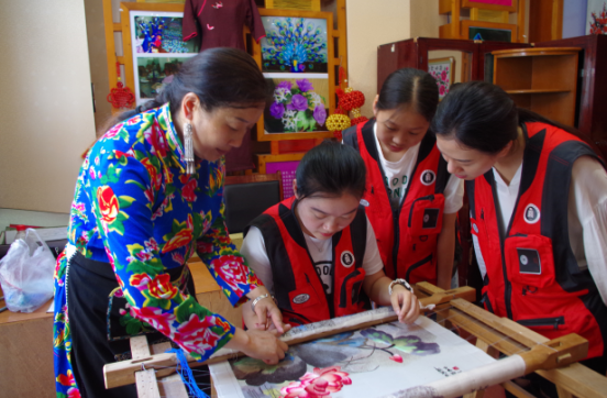 在队员们的谦虚请教下,杨老师耐心向队员们讲解羌绣的发展历程和展示独创的羌绣针法:双面压针绣。此绣法是羌族刺绣中广为使用和独具特色的针法之一。队员们在赞叹羌绣的魅力之时还虚心向杨老师请教绣针法,体验压针绣。