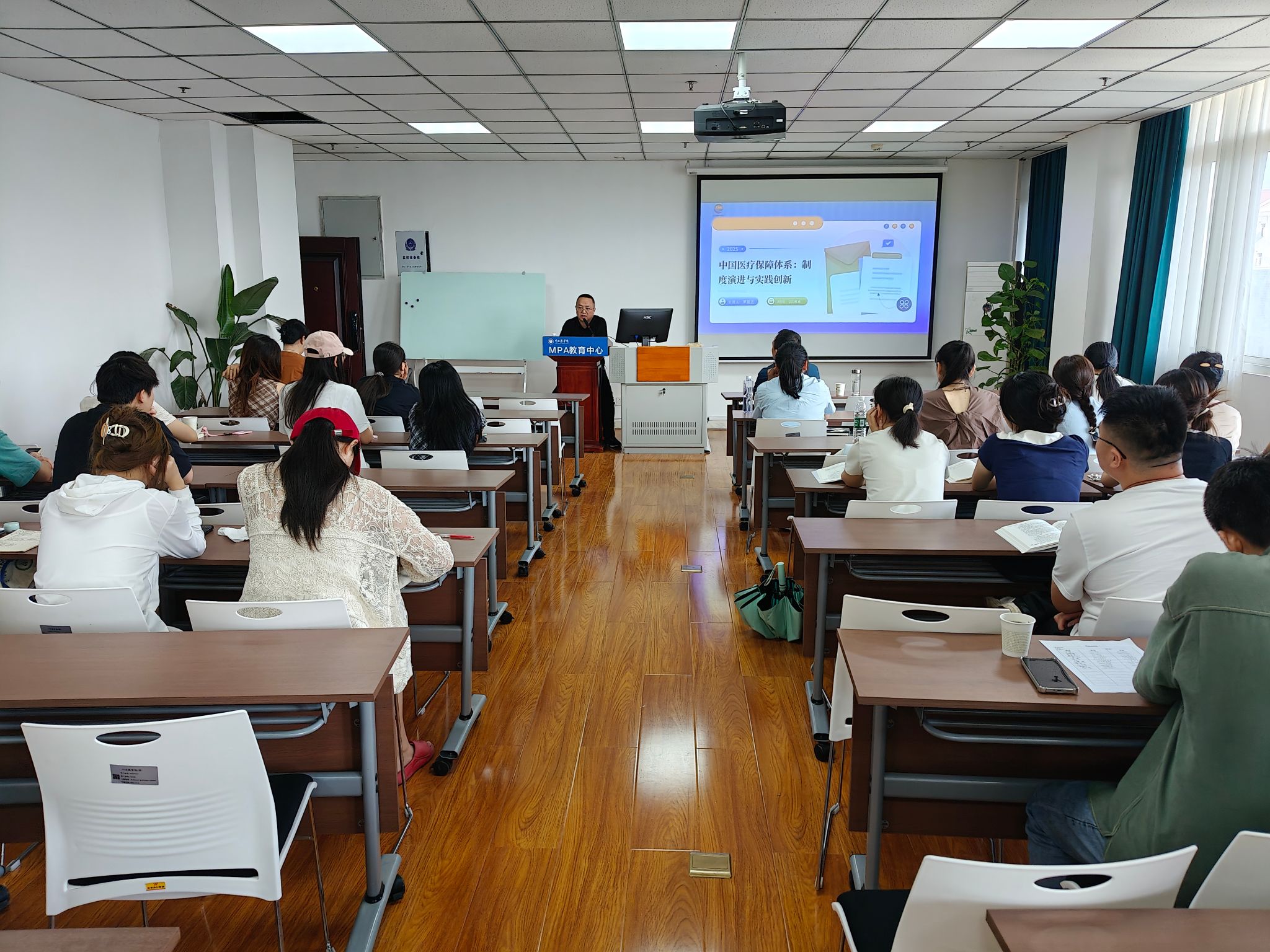 讲座中,罗晨艺系统阐述了中国医疗保障体系的构成、基本医疗保险的发展历程与运行机制,并展望了行业未来发展方向。他结合南充市医保局的丰富实践经验,深入剖析了居民参保、门诊统筹、医保支付方式改革等社会热点问题,并分享了宝贵的实务案例。