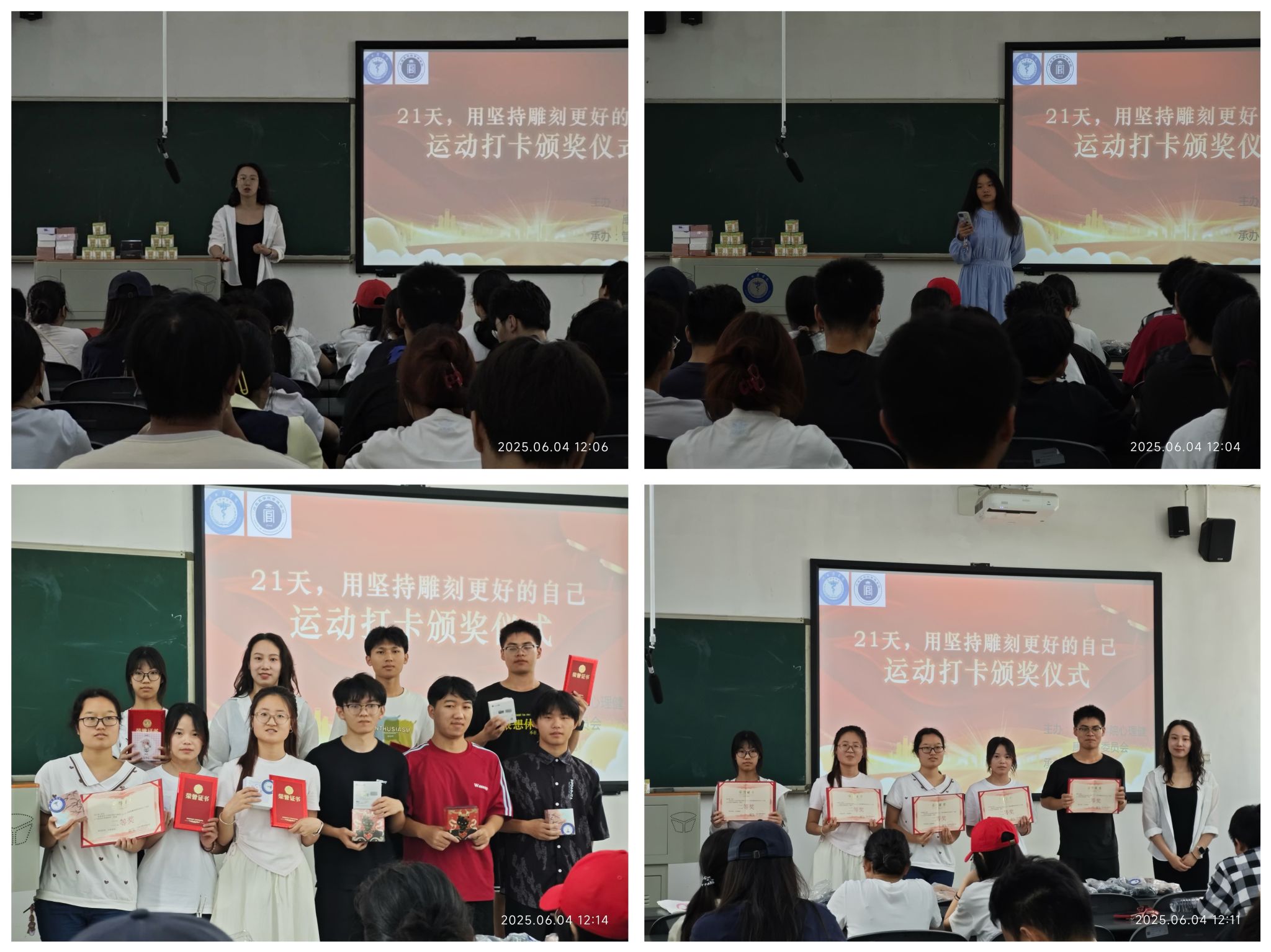 为引导大学生磨砺自律品格、促进身心健康发展,6月4日,由川北医学院心理健康教育委员会主办,管理学院承办的“21天,用坚持雕刻更好的自己”主题运动打卡活动圆满结束,活动在高坪校区图信楼101教室举行颁奖仪式。