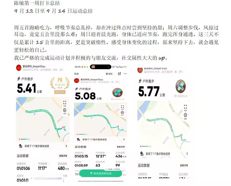 活动分初赛与复赛两个阶段有序开展。初赛阶段(9月5日至9日),参赛学生需围绕生理、心理、社交三个维度,制定目标清晰、措施具体的健康计划书。经评审,共有来19个专业的54名同学脱颖而出,进入复赛。在复赛阶段(9月12日至25日),选手们开展了为期14天的线上健康打卡,每周提交过程记录与阶段反思。活动工作组对打卡内容进行真实性核验,确保实践过程真实有效。