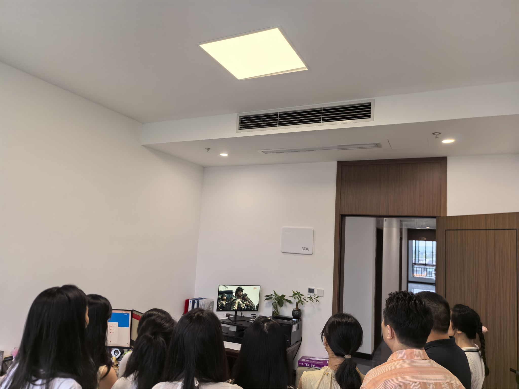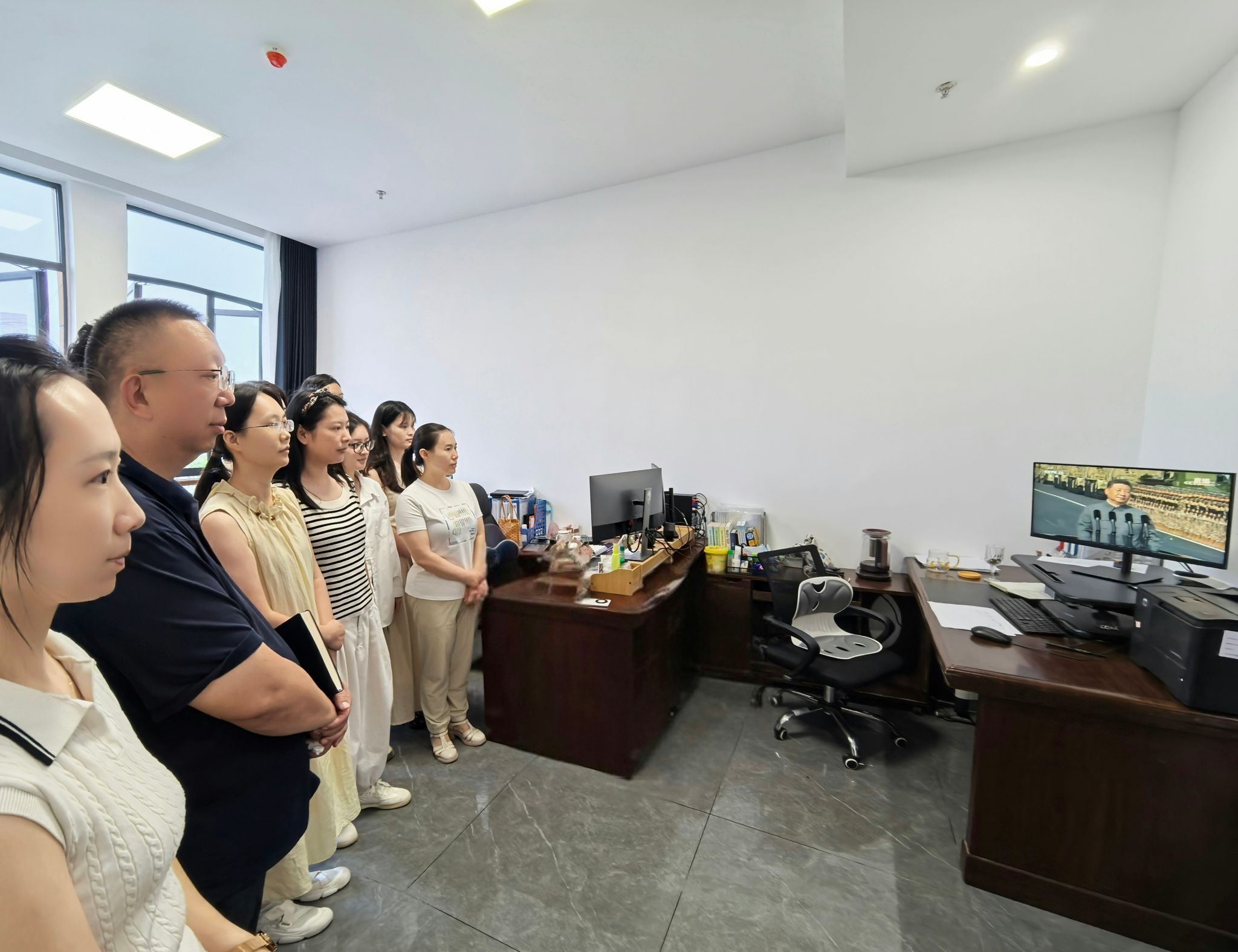 党支部全体成员怀着崇敬之心,聚焦屏幕,屏幕上,受阅部队列队完毕,等待着庄严的检阅时刻。45个方(梯)队在党旗、国旗、军旗引领下,按照实战化、模块化、体系化编组,展示国威军威。处内成员见证新型坦克、舰载机、歼击机、高超声速、防空反导、战略导弹等国产现役主战装备集中展示。这些装备成体系、要素全、实战化,涵盖各类型力量。