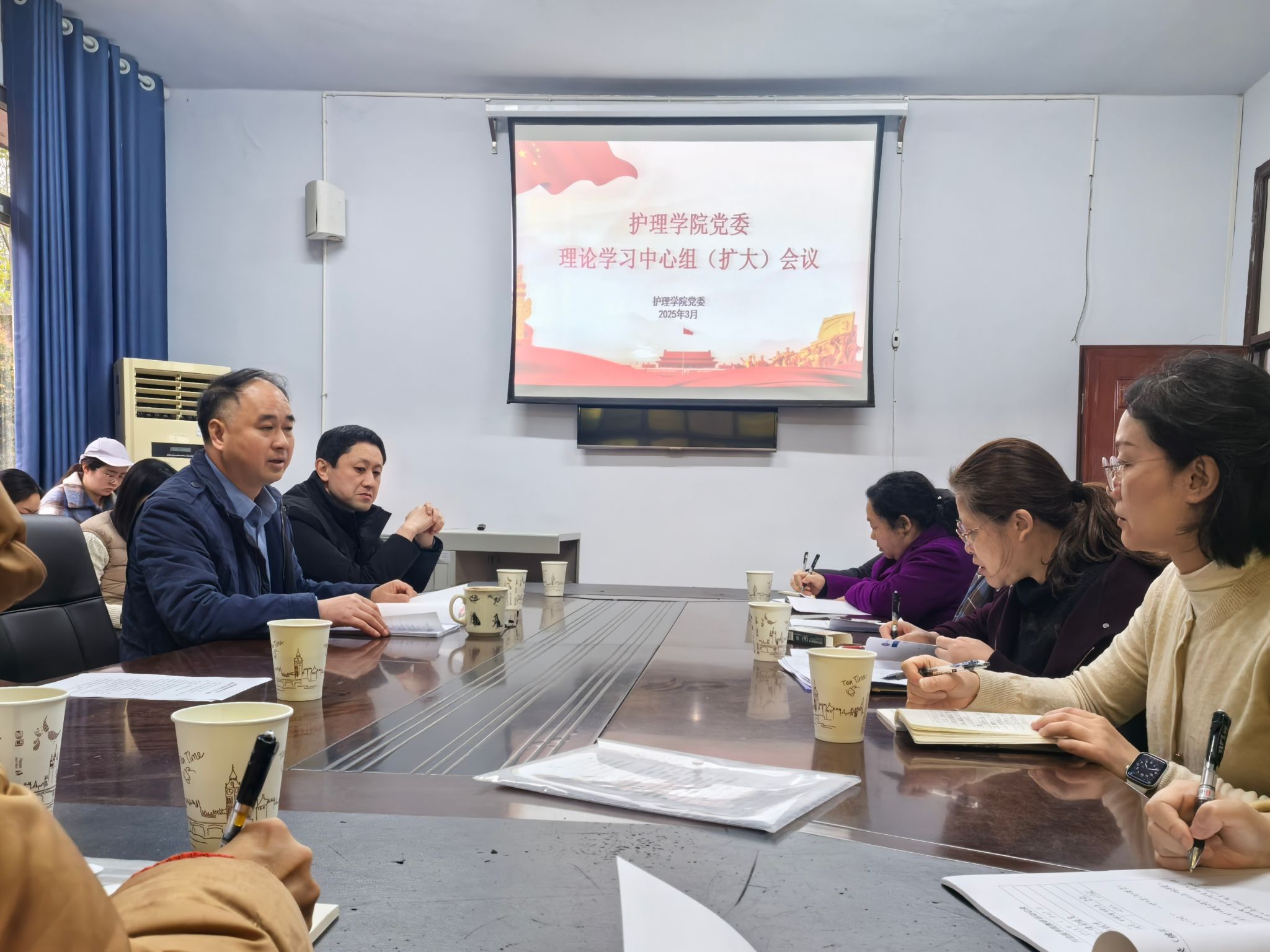3月28日下午,护理学院党委在顺庆校区思源楼二楼会议室召开理论学习中心组(扩大)会议。理论学习中心组成员、党支部书记、教职工参加学习,会议由护理学院党委书记马静主持。