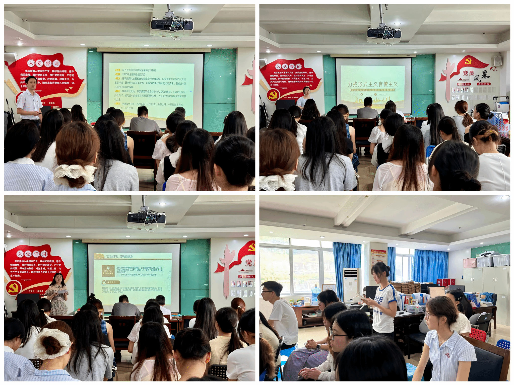 首先,谢鹏以《持续推进新时代党的作风建设》为题进行党课讲授,围绕习近平总书记关于加强党的作风建设的重要论述、中央八项规定精神展开详细解读,重点讲解了对师生党员的具体要求以及如何通过加强作风建设促进建设发展,让党员们深刻认识到作风建设对于党和国家事业发展的深远意义。本科学生第二党支部书记刘欢讲授《力戒形式主义官僚主义》党课,结合实际案例,讲解了形式主义、官僚主义对党和国家事业及群众利益的严重损害,为全体师生敲响警钟,让“作风建设无小事”的理念深入人心。本科学生第一党支部书记张怀艺讲授《以优良作风奋进新征程》党课,结合典故,强调了求真务实、担当作为、不忘初心等作风品质的时代意义,引导师生主动对标,锤炼政治品格,以优良作风践行初心使命。在学习讨论环节,党员们围绕学习内容结合自身实际,踊跃发言,大家纷纷表示,要深刻认识到作风建设的长期性和艰巨性,坚决贯彻落实中央八项规定精神,从自身做起,从身边的小事做起,力戒形式主义、官僚主义,切实提高工作效率和服务质量。