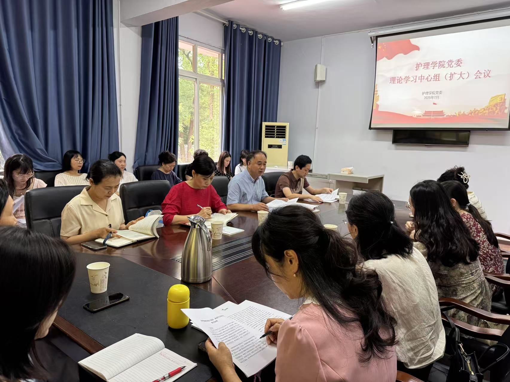 7月11日上午,护理学院党委在顺庆校区思源楼二楼会议室召开理论学习中心组(扩大)会议。理论学习中心组成员、党支部书记、教职工参加学习,会议由护理学院党委书记马静主持。