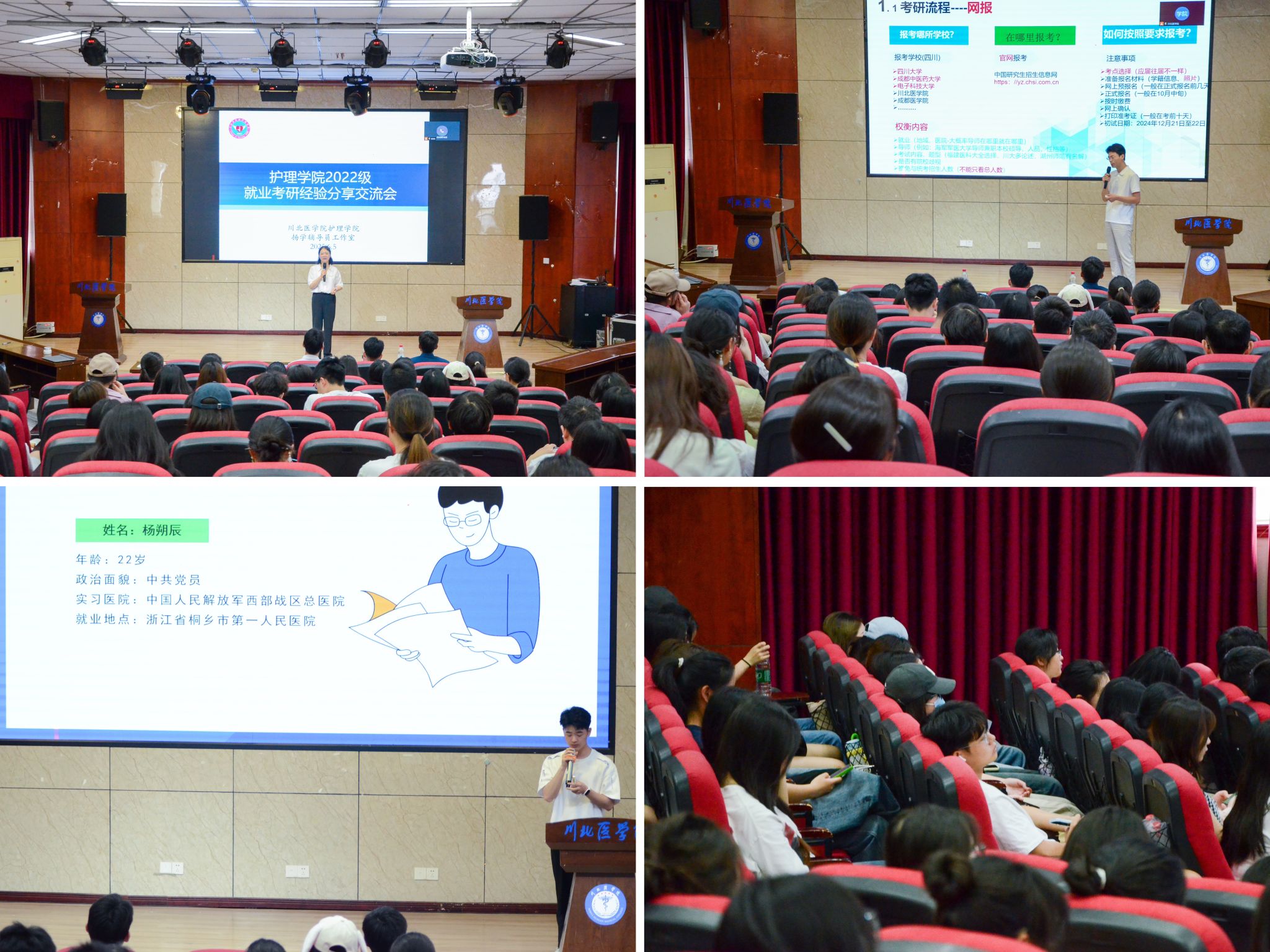 为帮助我院2022级学生更好地规划实习与就业,进一步明确未来发展方向,6月5日上午,护理学院在高坪校区图信楼407教室举办了就业考研经验分享会。本次分享会分别邀请了成功考研和就业的应届毕业生进行经验交流。200余名2022级学生参加了分享会。