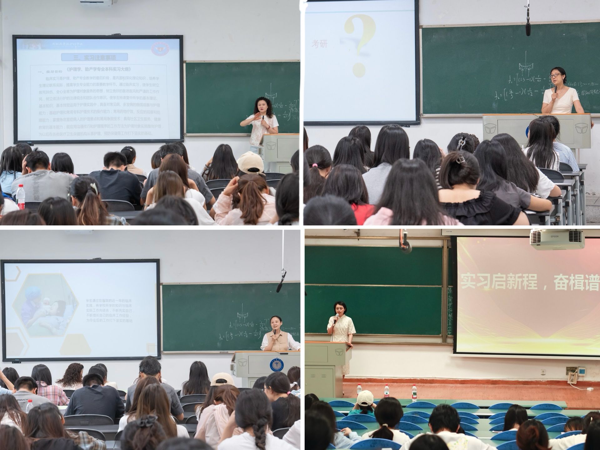 实习动员会以专业合班为单位进行。学院领导、各科室及教研室老师分别从不同角度为同学们进行了全面深入的专题教育。护理学院副院长李莉结合当前应用型护理人才培养目标,要求同学们要主动适应角色转变,从学生向准护士迈进;要广泛涉猎、勤于实践,加强多领域临床技能的学习与锤炼;要科学规划,努力实现实习实践、考研深造与未来就业的协调平衡发展。教务科毛丽芳、赵芹两位老师重点解读了实习大纲相关要求,并着重讲解了毕业论文(设计)的具体规范、写作要求、时间节点及评审流程。儿科护理学教研室唐菁华老师强调了相关注意事项和医患沟通技巧。助产学教研室王敏、杨丽君老师则聚焦助产专业特色,就专业技能提升和职业素养培养给出了具体建议。研究生科杜姣老师针对有考研意向的同学,介绍了相关政策和备考策略。学生科辅导员老师分别就实习期间的请销假制度、安全纪律、人际关系处理、心理调适等方面进行了细致讲解和温馨提醒。