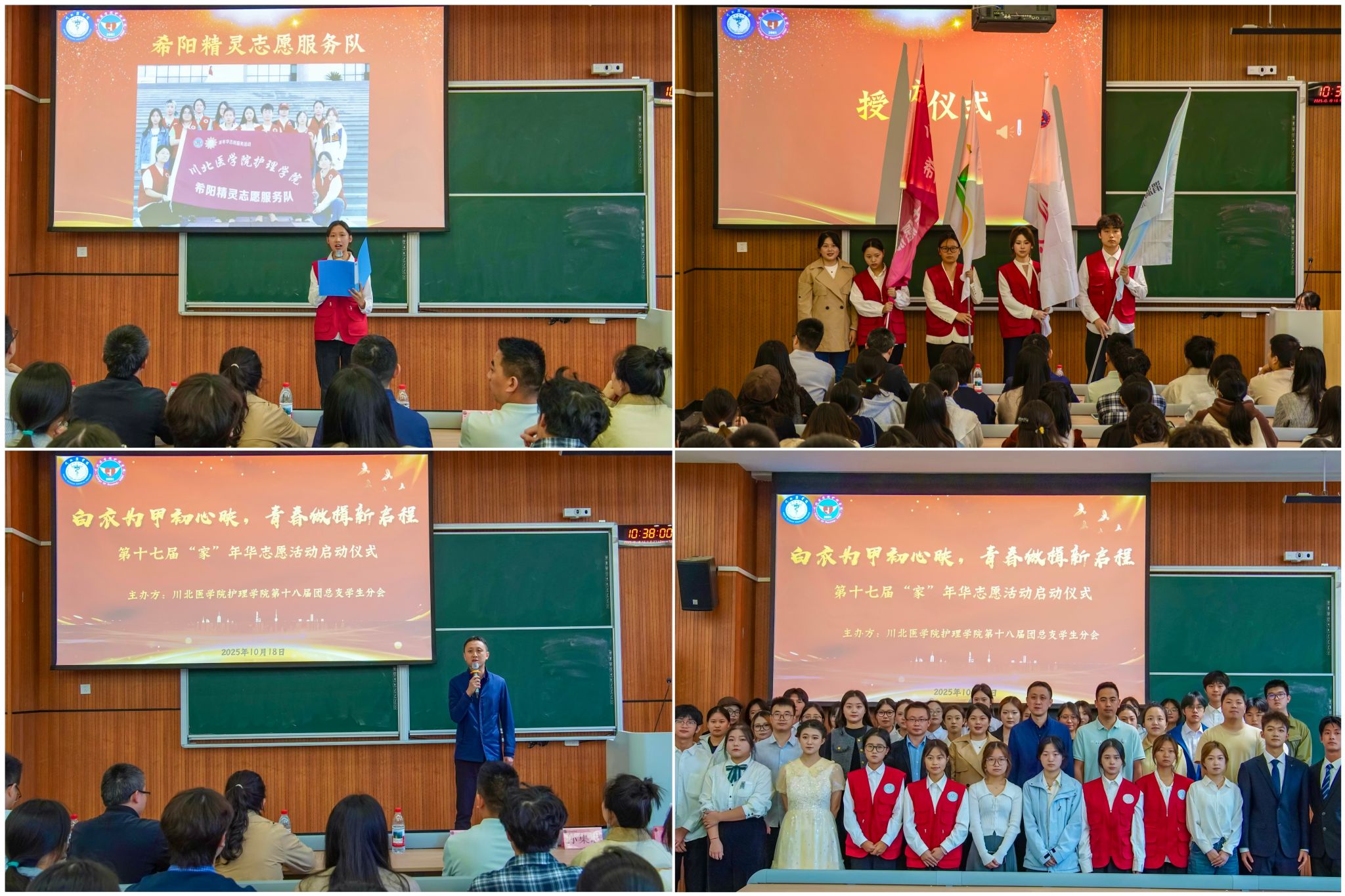 白衣为甲初心映,青春做楫新程启。10月18日,护理学院第十七届“家”年华志愿服务活动启动仪式在莲池书院北218教室隆重举行。护理学院党委副书记谢鹏、学生科辅导员及八支志愿服务队全体队员共同参与活动。
