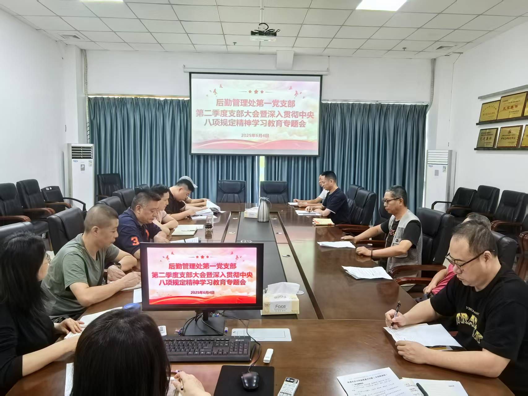 6月4日,后勤管理处第一党支部在后勤管理处会议室召开第二季度支部大会暨深入贯彻中央八项规定精神学习教育专题会。会议由支部副书记易俊主持。