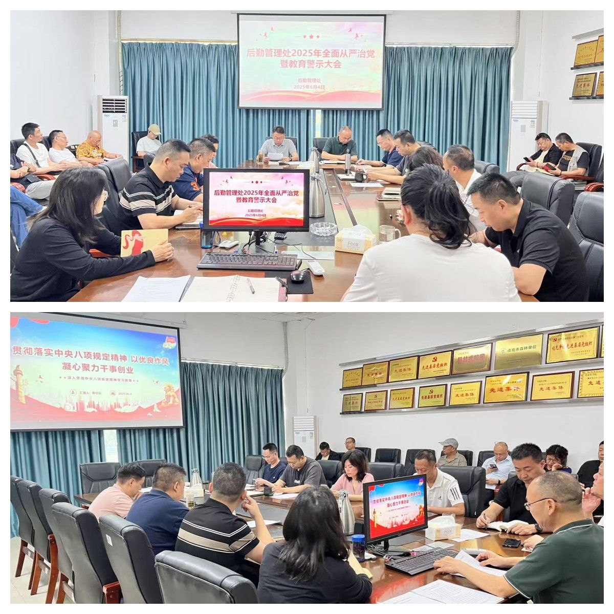 2025年6月4日上午,后勤管理处在部门会议室组织召开2025年全面从严治党工作会暨警示教育大会,全体正式职工参加,会议由后勤管理处处长代成书主持。