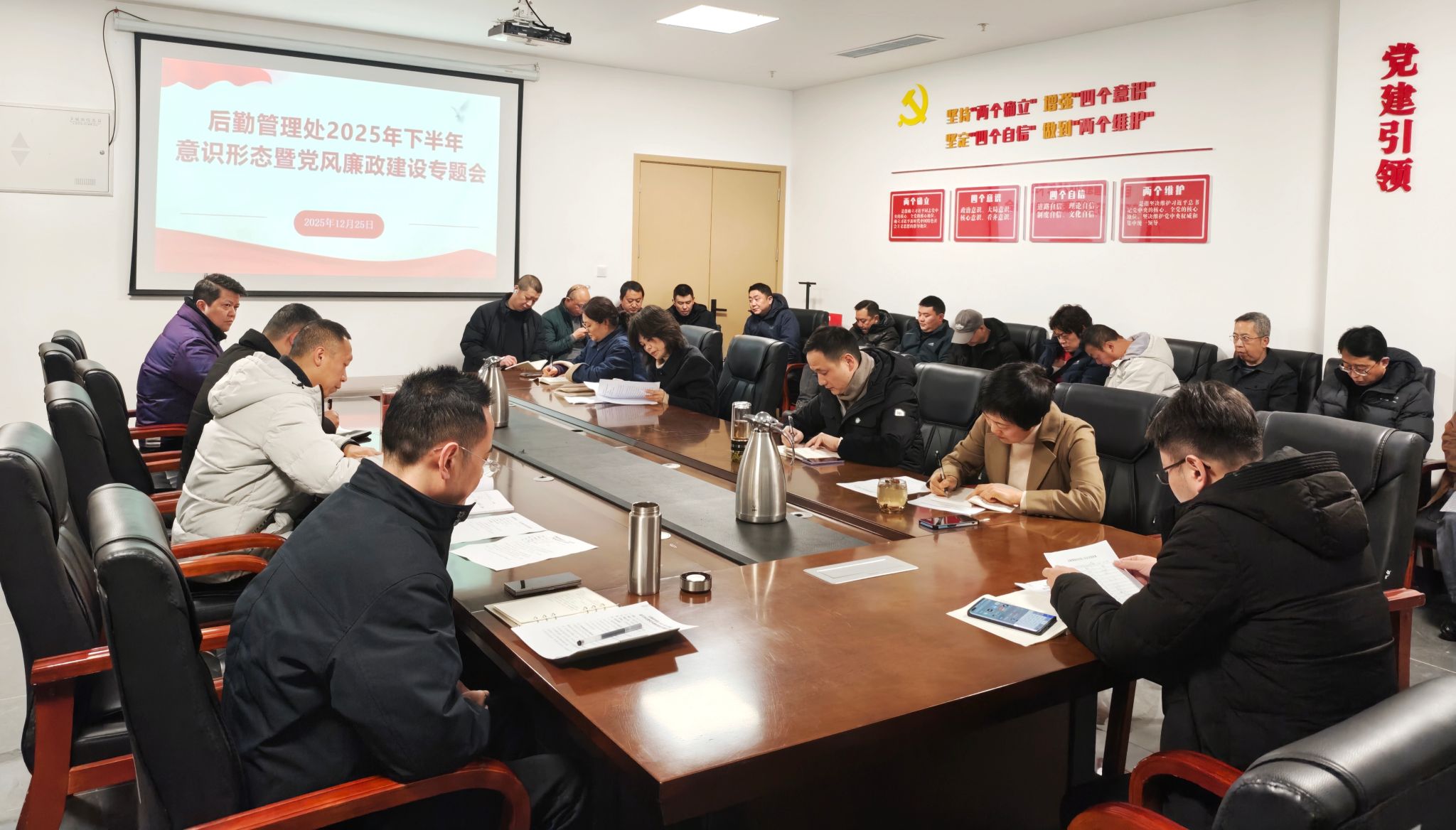 2025年12月25日下午,后勤管理处组织全体正式职工,在部门会议室召开2025年下半年意识形态暨党风廉政建设专题会,会议由后勤管理处处长代成书主持。
