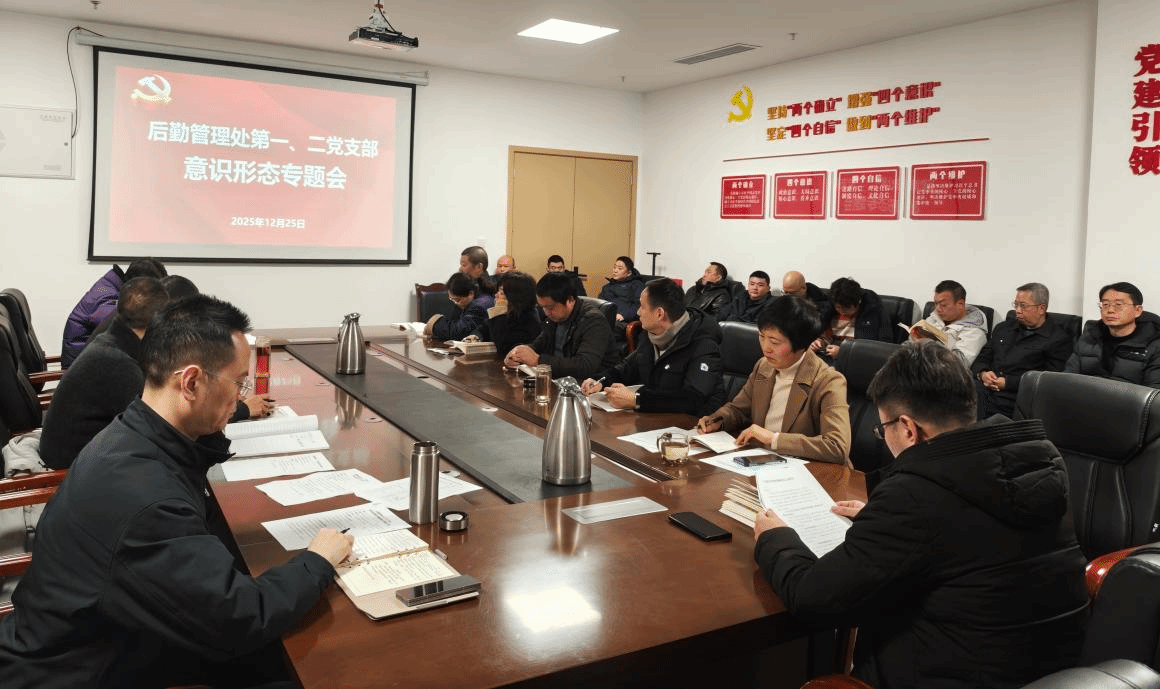 意识形态工作会上。首先传达学习了四川省委十二届八次全会公报,随后开展了意识形态工作研判:各科室汇报了职工思想动态、工作开展情况和风险隐患排查情况,第二党支部书记张小英系统总结了2025年下半年后勤管理处意识形态工作,肯定了工作成效,分析了当前面临的新形势与新挑战,并对下一步如何巩固意识形态阵地、加强风险隐患防控和加强职工思想引领提出了明确要求。