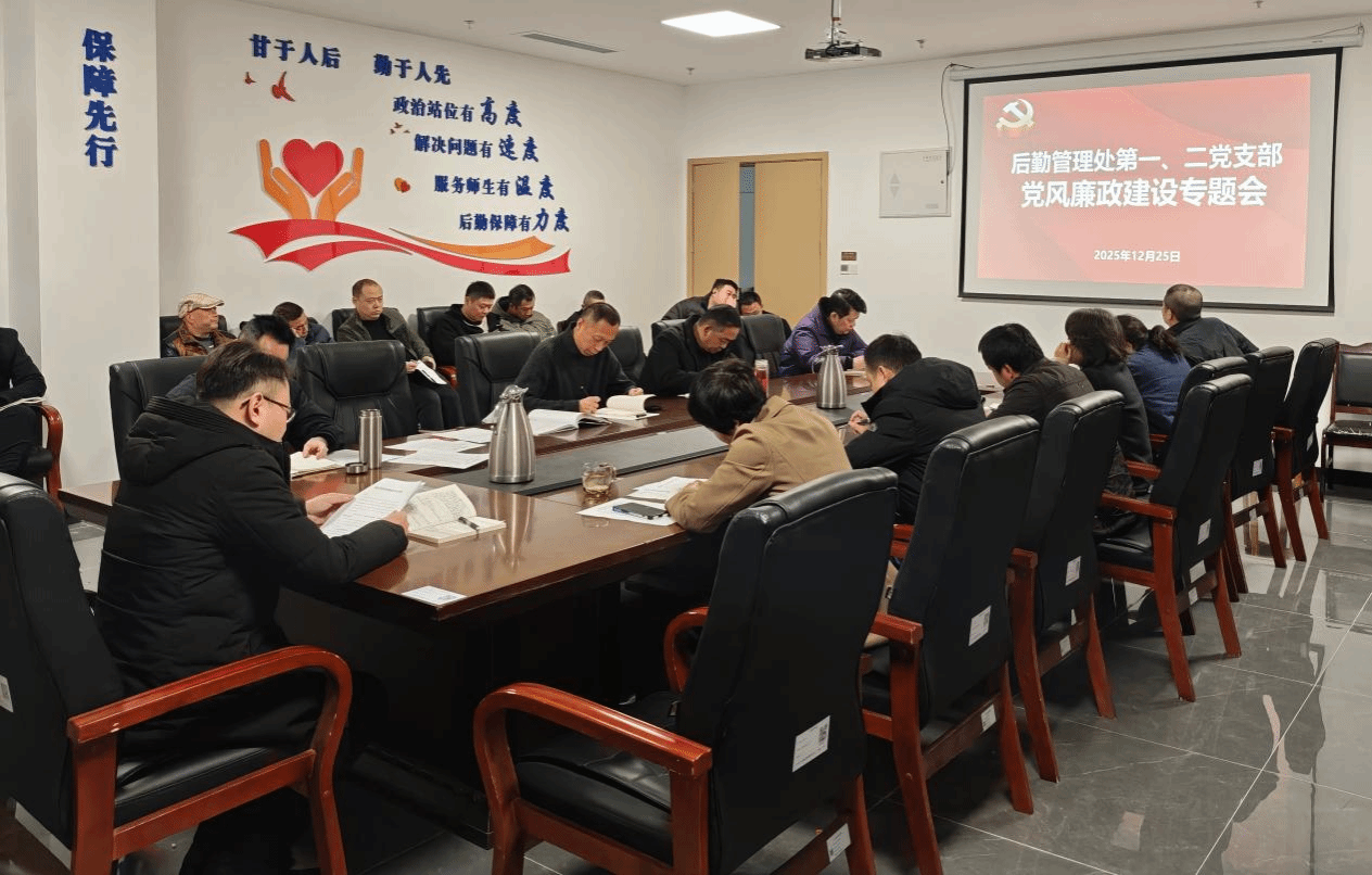 为深入推进全面从严治党,抓实安全稳定工作,2025年12月25日下午,后勤管理处第一、二党支部在部门会议室联合开展2025年下半年意识形态与党风廉政建设专题会议。