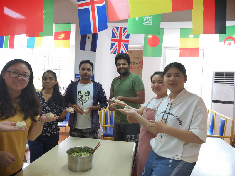 参加本次活动的留学生和中国学生,先协助宿管阿姨准备包包子所需的食材,考虑到留学生来自非洲和“一带一路”沿途的国家,他们的宗教信仰差异和食物的禁忌,宿管阿姨贴心的准备了两种馅料,一种是酱肉馅儿,一种是鸡蛋韭菜馅儿,其中鸡蛋韭菜馅儿受到了留学生的一致好评。同学们感受着来自宿管阿姨关怀的同时,语言和文化交流,欢笑声不断,大家吃得津津有味。午间,留学生们纷纷从教学楼下课归寝,都争先恐后的向阿姨和中国学生请教包包子的方法和技巧,通过宿管阿姨和中国学生的帮助,留学生们都制作出了独一无二的包子。最后大家一起享受了自己动手做出的食物,并合影留念。