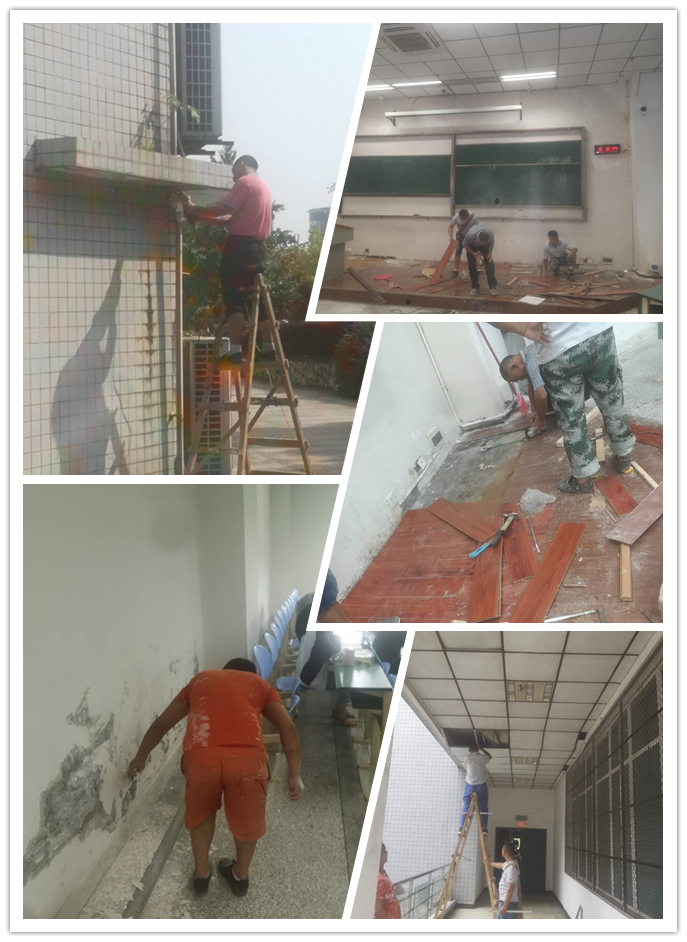 检查结束后,我处房产维修中心立即安排施工队伍进行维修工作。疏通了楼顶雨水管,替换了空调排水管,更换了掉落的天花板,修补了掉落的踢脚砖,修复了天花板与墙壁之间因材料不同的产生的收缩缝。尤其对损坏严重的402教室做了重点维修,重新粉刷教室讲台面的墙壁,更换损坏的木地板。还师生一个安全、舒适的教学环境。