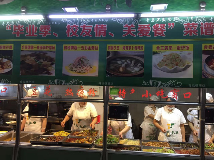 我处饮食服务中心举行了“青春不散场,相约在食堂”的活动,旨在“最后一公里”带着母校的温暖,祝福毕业生学子。在保证学生们饮食安全的基础上,厨师们通过精细地加工制作,推出了一系列带祝福性的新菜品,如荤菜有“步步高升、二牛争春、福星高照、合家团圆、一帆风顺、良师益友”;素菜有“春回大地、锦绣前程、富贵迎门、金玉满堂、青春永驻”;汤菜有“海阔天空”。通过这些饱含美好祝福的菜名,表达出了饮食服务的工作人员对毕业生的殷切希望与期待。