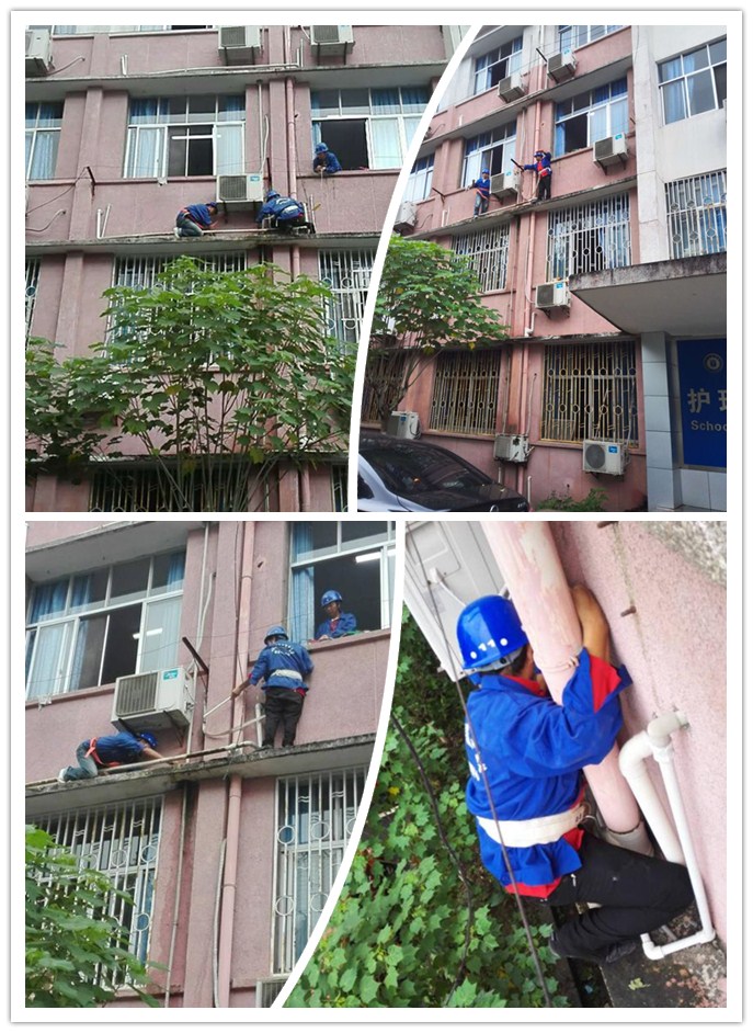 9月25日,顺庆校区思源楼外墙主水管发生漏水,我处能源管理中心立即派遣水电工赶赴现场维修。水电工临时化身“蜘蛛人”,娴熟的攀爬出外墙对主水管进行维修,他们没有轻功、掌心也吐不出“丝”,却依靠着几根绳索在“水泥丛林”里飞檐走壁,化腐朽为神奇,让我们为他们的勇敢与敬业精神点赞。