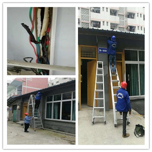 为进一步保障校园用电的安全与稳定。近日,后勤管理处能源管理中心维修人员对顺庆校区各配电设施设备、线路进行逐个排查,在检查过程中发现简易六、七、八教室配电设施损坏严重、线路老化,存在安全隐患。针对发现的问题,能源管理中心维修人员及时进行了维修更换,保证了师生用电安全。
