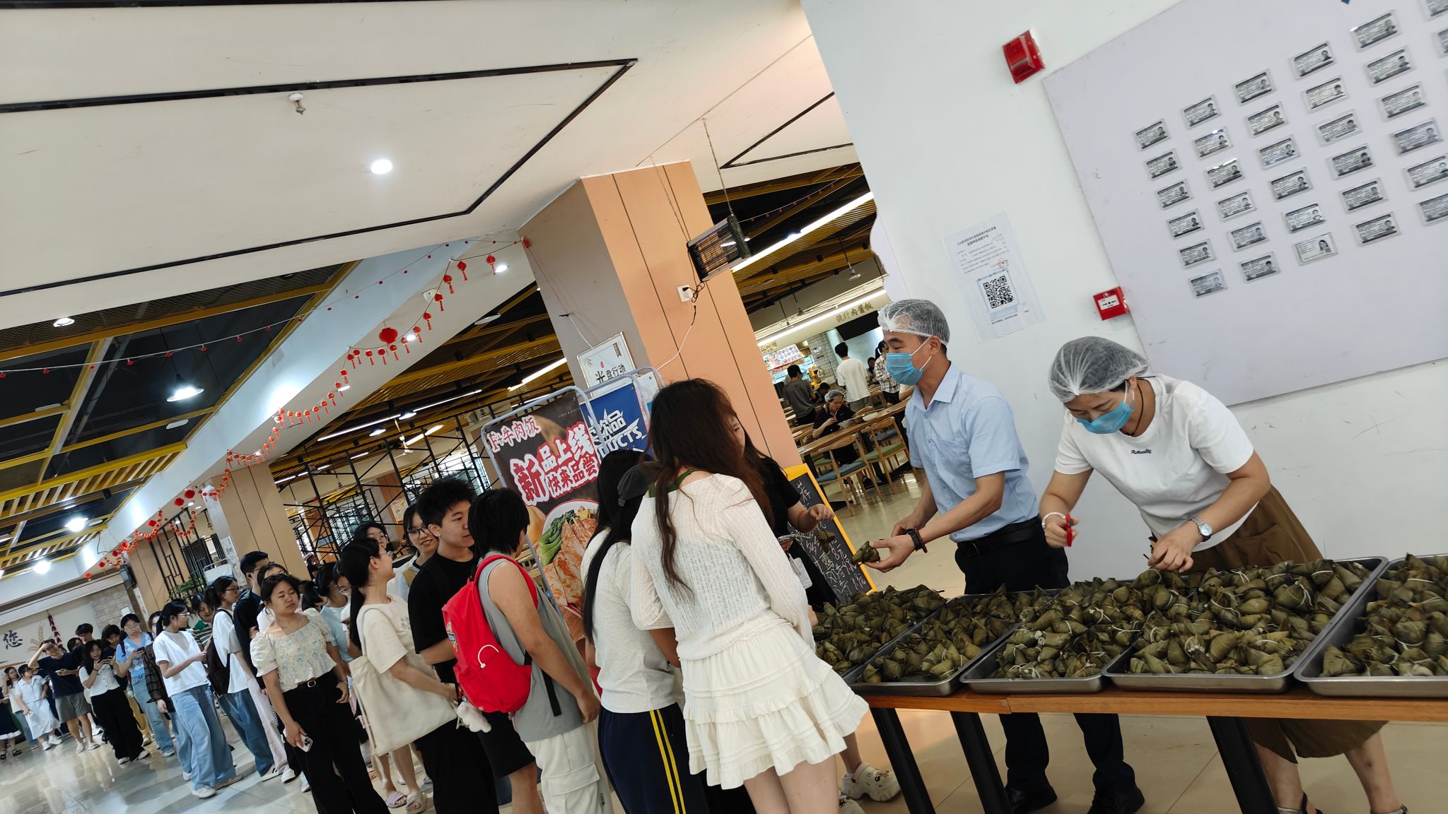 午餐时段,师生免费领取了新鲜出炉、热气腾腾的美味粽子,让浓郁粽香飘满整个食堂。