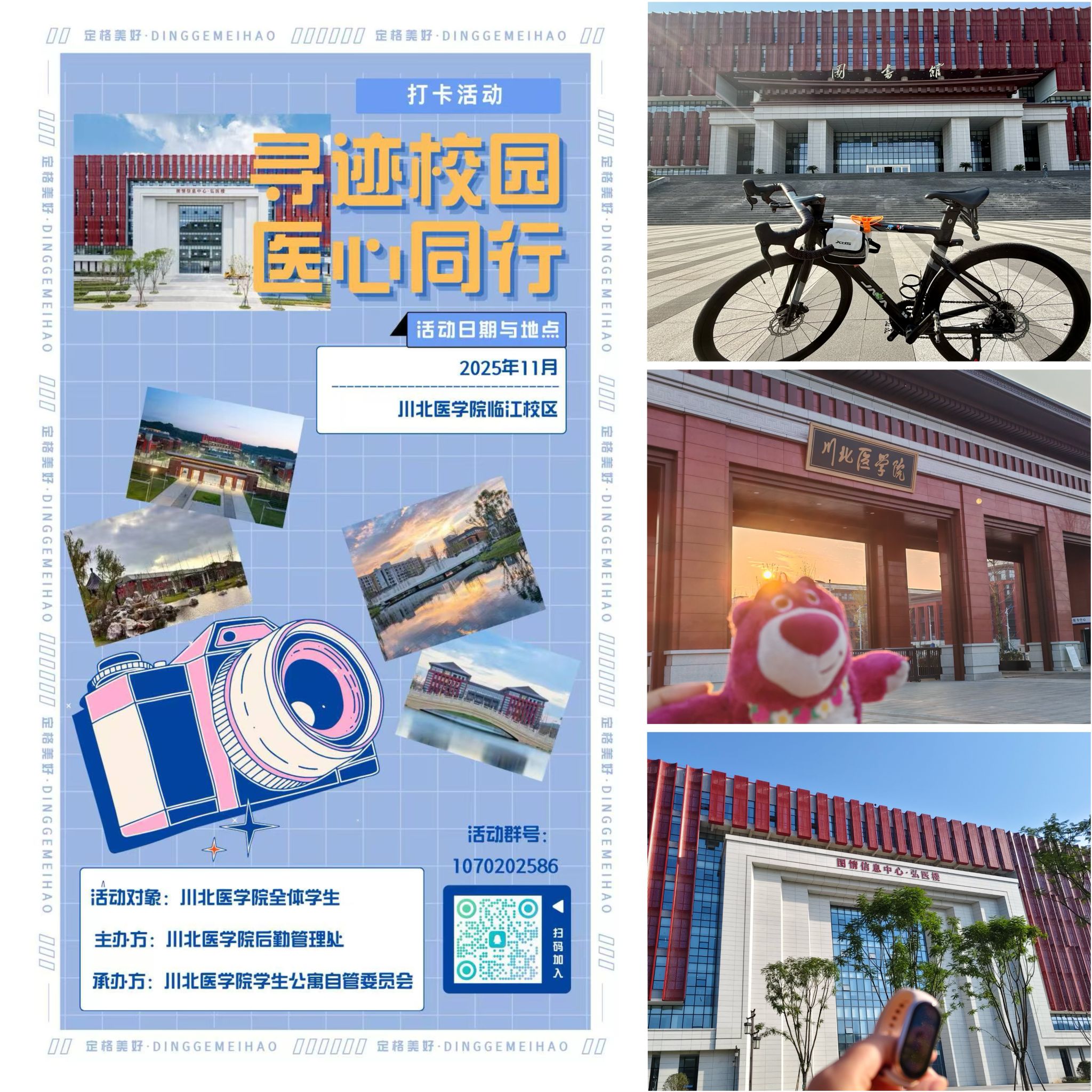 为丰富校园文化生活,帮助学生快速融入新环境、熟悉新家园,11月29日至12月2日,由后勤管理处主办、学生公寓自管委员会承办的“寻迹校园,医心同行”趣味打卡活动在临江校区顺利举行。