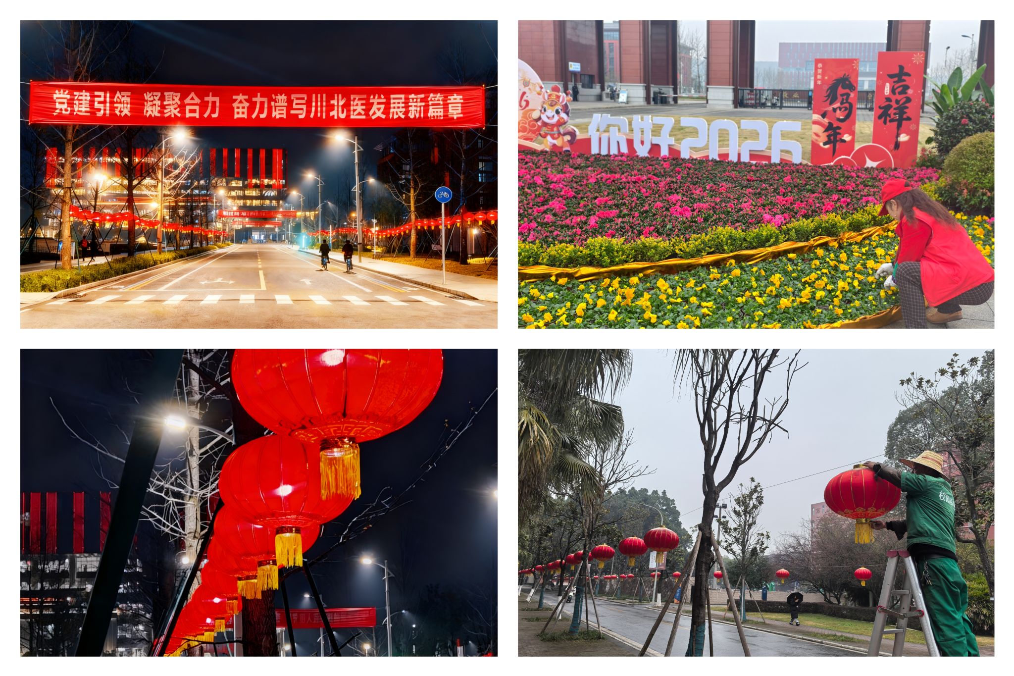 在新年到来之际,为弘扬中华优秀传统文化,营造欢乐祥和、温馨喜庆的节日氛围,后勤管理处提前谋划、精心组织,在临江、顺庆两校区同步开展节日环境布置工作,以红火热烈的景观装点校园,喜迎2026年新年的到来。