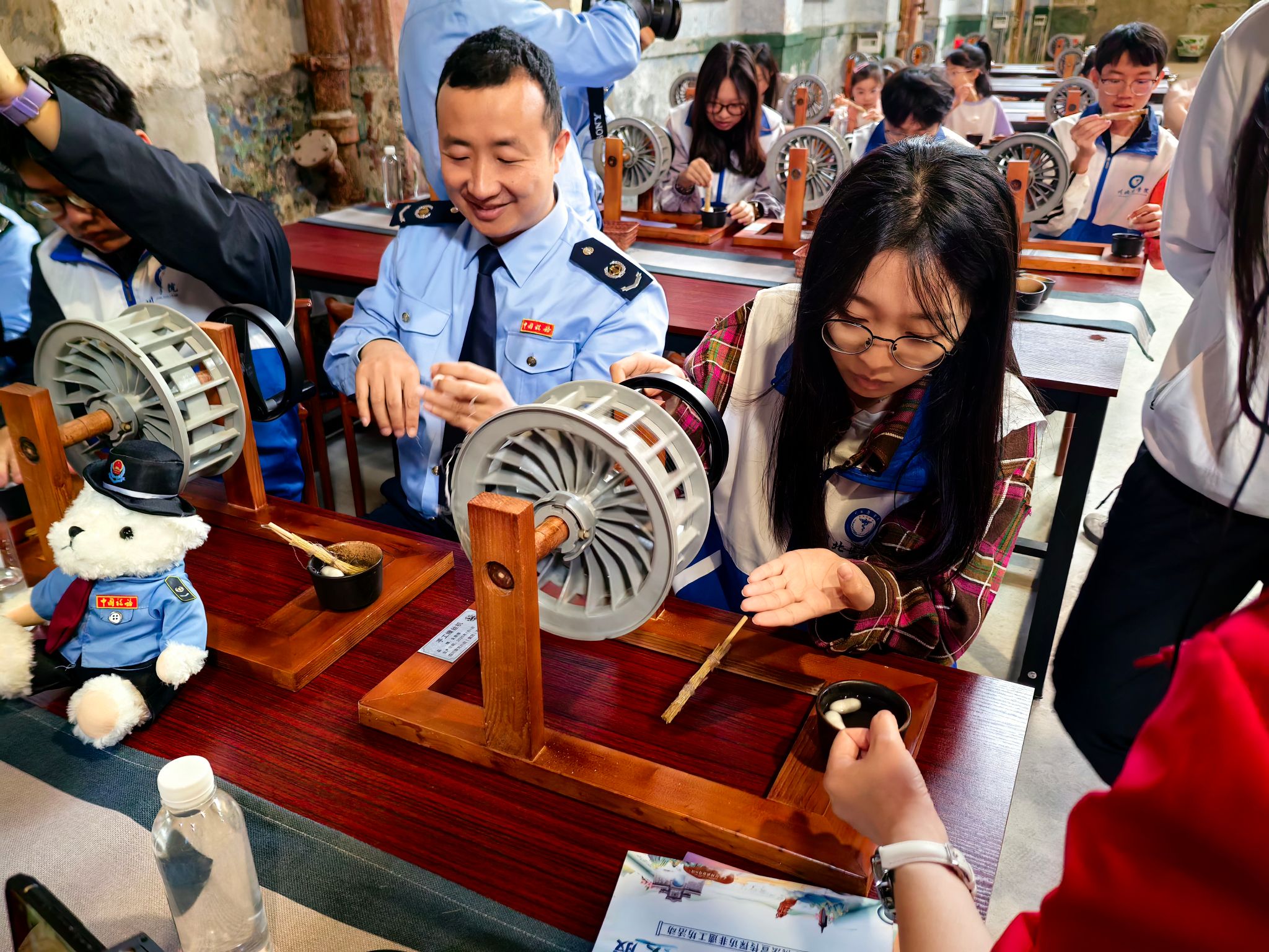 随后大家移步研学馆,一场别开生面的非遗体验盛宴拉开帷幕。靛蓝的染料在瓷盆中轻轻荡漾,师生们化身“染艺小匠”,与南充市税务局工作人员密切协作,灵巧地将织物折叠、捆扎、浸染。手工缫丝机缓缓转动,发出轻柔的嗡鸣,大家屏息凝神体验古法手工缫丝,小心翼翼地将蚕茧放入温热的水中,耐心寻找丝头,然后轻轻牵引,让洁白的蚕丝从蚕茧中缓缓抽出。丝线在指尖缠绕,大家既感受到了缫丝工序的繁复艰辛,又为亲眼见证蚕茧化丝的神奇过程而欣喜不已。