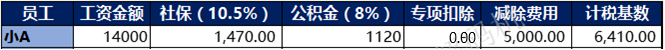 小A每月工资14000,社保按工资全额10.7%计算缴纳,公积金比例8%,无其他扣除事项;