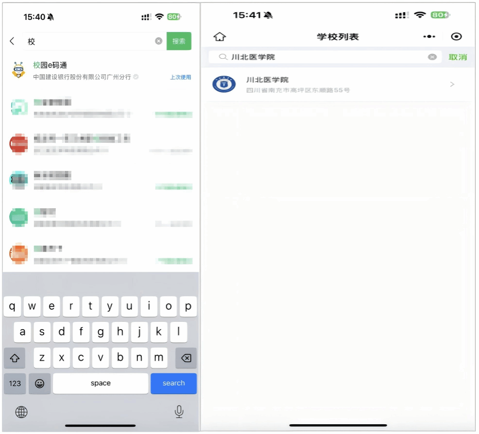 二、请分别在微信或支付宝APP中搜索“校园e码通”,点击进入后系统应默认显示就近已开通的学校;如没有显示,请搜索我校全名或者定位所在城市(南充),并选择学校。