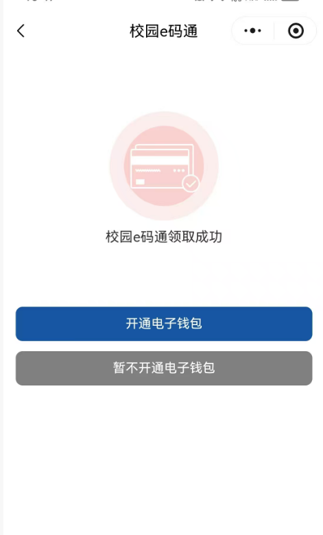 四、正确的信息输入完成后,页面提示领取成功及“开通电子钱包”“暂不开通电子钱包”两个按钮。微信和支付宝认证可选“暂不开通电子钱包”直接进入校园e码通页面,云闪付认证请务必选择“开通电子钱包”并按后续流程用本人银行卡进行实名认证。