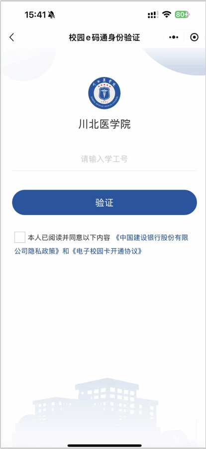 重要提示:因建设银行校园e码通的密码校验规则要求复杂密码,若遇原校园卡密码输入后页面提示密码简单的情况,认证人可从“川北医学院计财处公众号 -> 综合服务-> 密码修改”功能下修改密码为适当复杂的密码。
