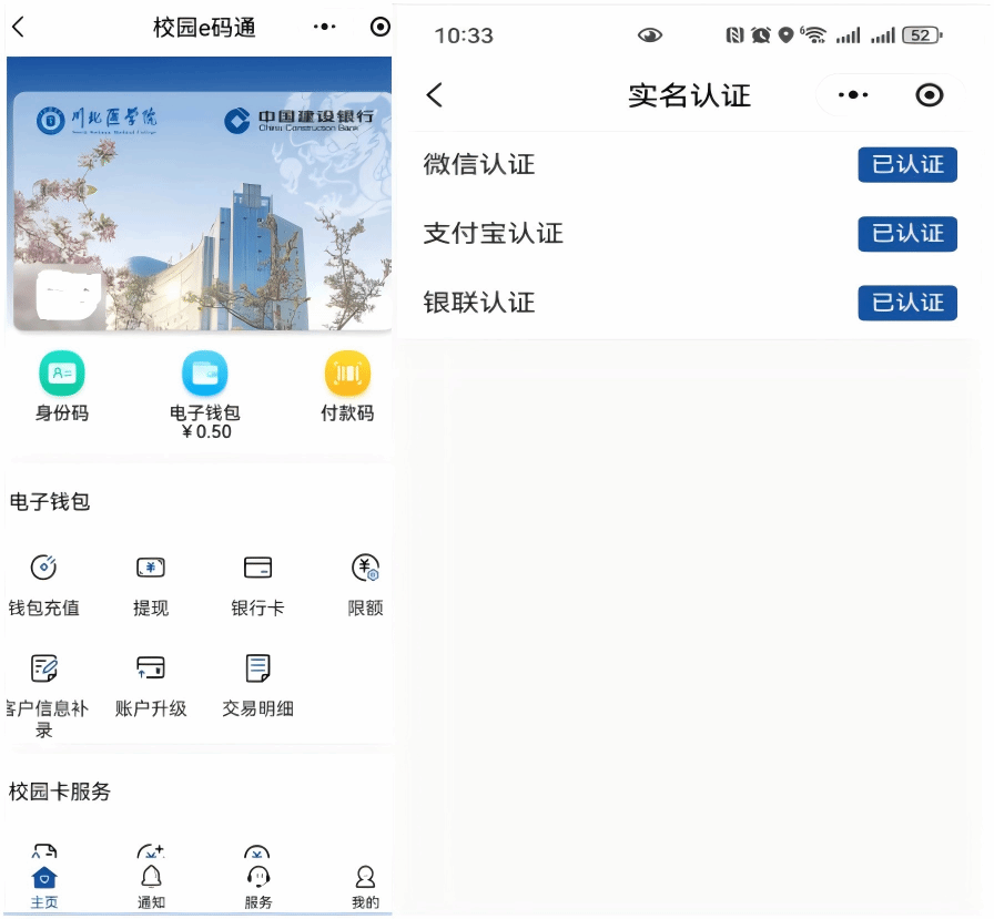 进入“校园e码通”小程序首页,点击右下角导航栏“我的-实名认证”,即可查询各支付渠道的实名认证情况。