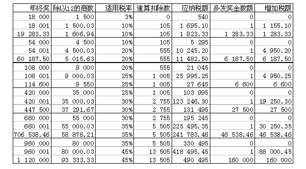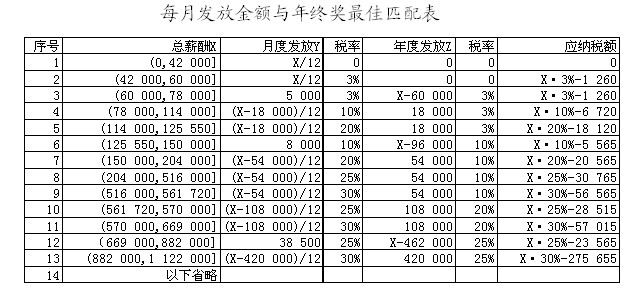 应该来说5 880是年收入120 000元情况下,缴纳个人所得税的最低额,那么该如何找出每月发放的金额与年终一次性发放金额的平衡点呢?首先,我们要确定年终一次奖金的临界点,详见下表(假设不存在补差问题):