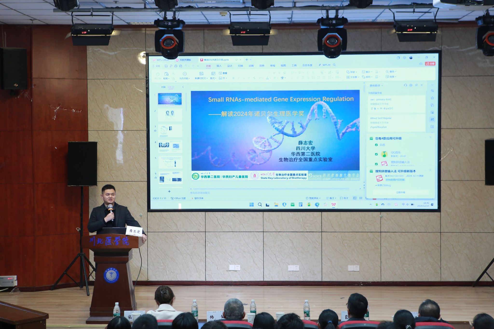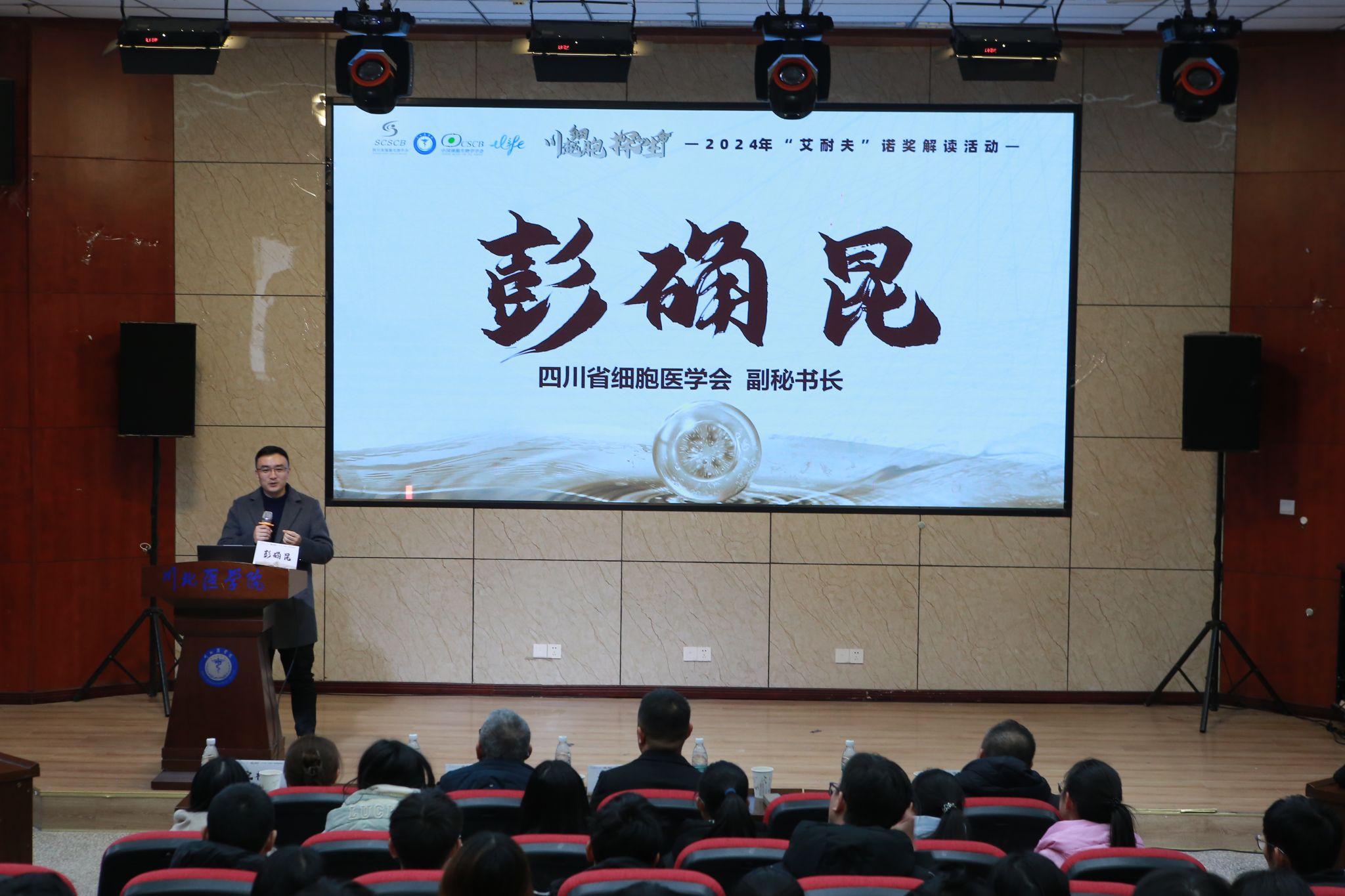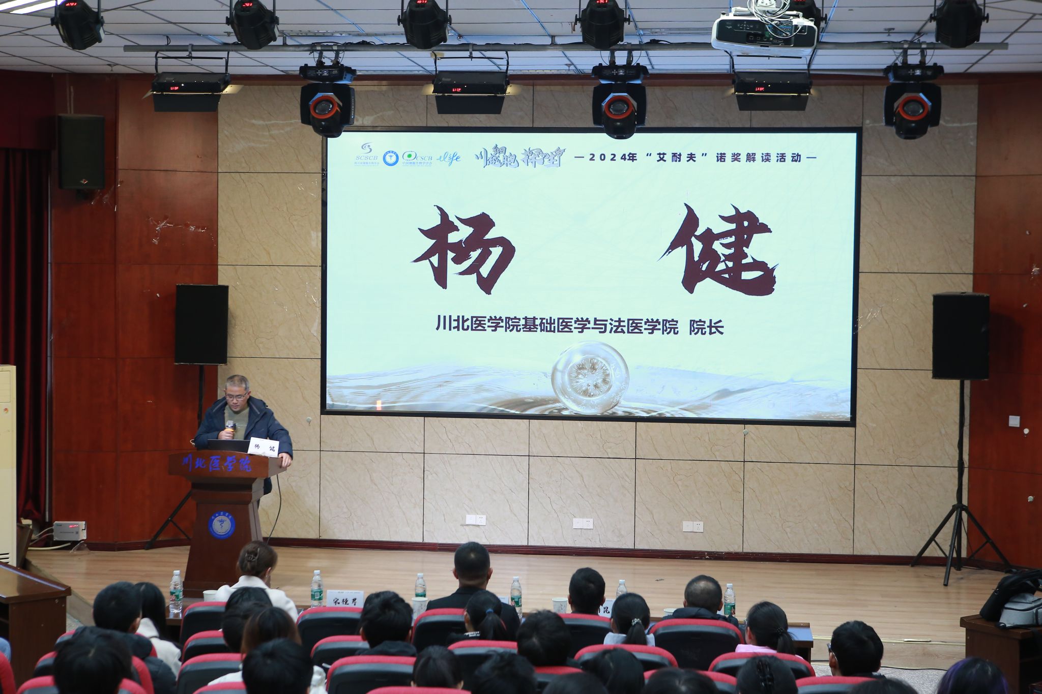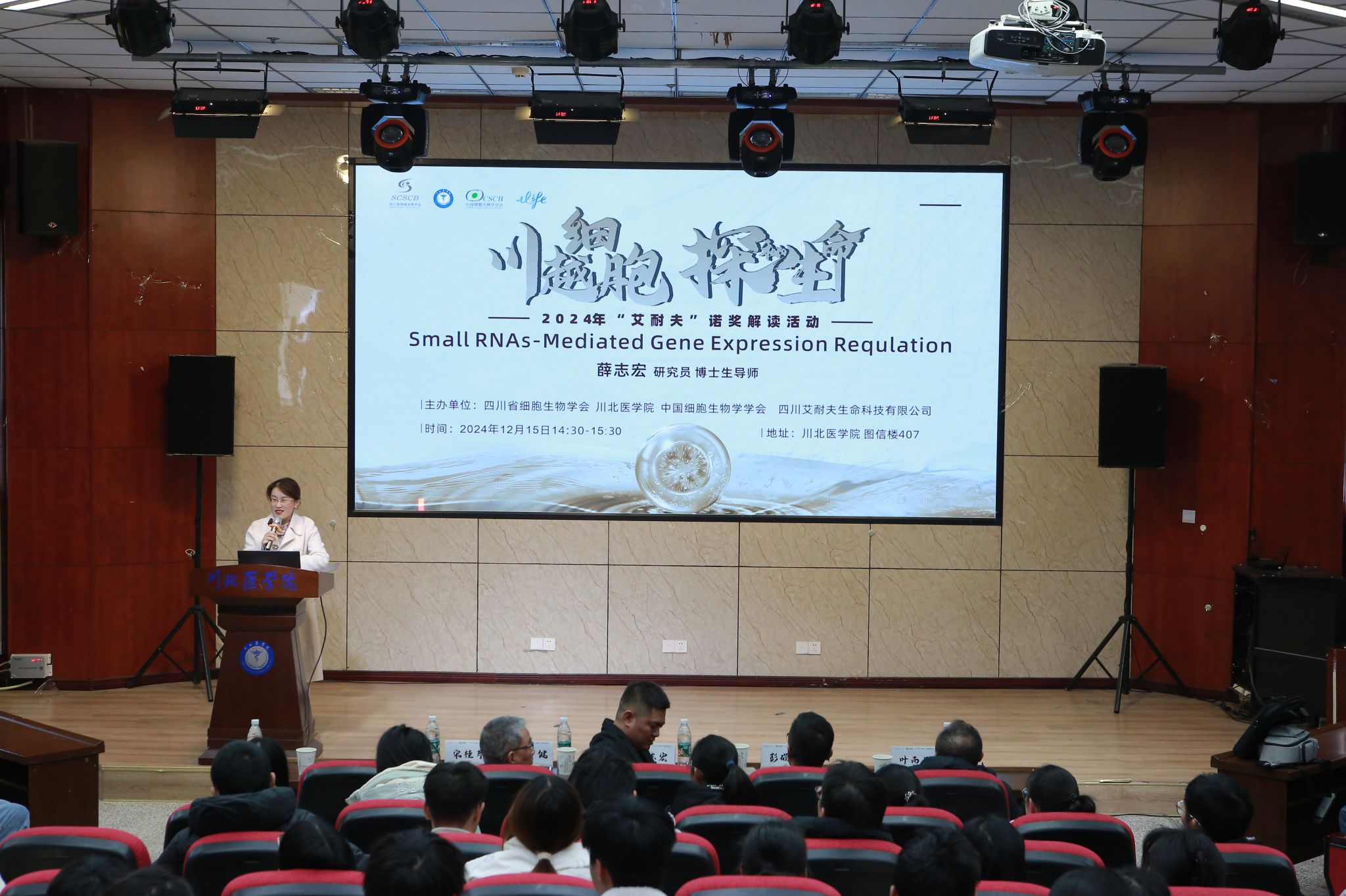 12月15日,由四川省细胞生物学会、川北医学院、中国细胞生物学学会、四川艾耐夫生命科技有限公司主办,川北医学院基础医学与法医学院承办的“‘川’越细胞,探秘生命—2024年‘艾耐夫’诺奖解读活动”在高坪校区图信楼407举行。四川大学薛志宏教授、四川省细胞生物学会副秘书长彭确昆、学校基础医学与法医学院院长杨健、副院长宋桂芹,四川艾耐夫生命科技有限公司销售总经理叶雨凡出席了本次活动。活动采用线上线下同步播出的形式,现场参加活动的师生代表共200余人。本次活动由宋桂芹主持。