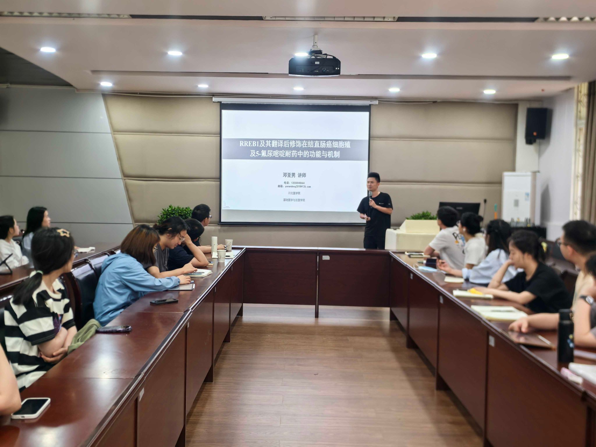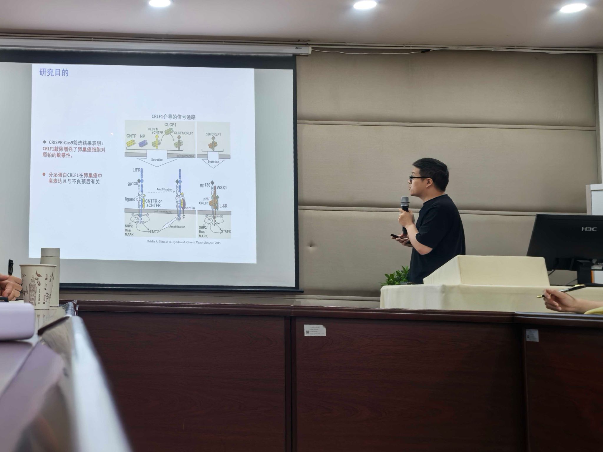 向聪博士以《CRLF1调控卵巢癌耐药及肝纤维化的双重作用机制》为题,通过卵巢癌为切入口,从研究目的及研究结果及下一步研究计划等方面分享了CRLF1促进卵巢癌耐药以及肝纤维化进程的机制两个方面的研究成果。邓亚男博士在《RREB1及其翻译后修饰在结直肠癌增殖与耐药中的功能与机制》的报告中,则以结直肠癌为对象,结合博士阶段的主要研究工作、研究结果、个人研究经历等方面详细介绍了RREB1及其翻译后修饰产物在结直肠癌增殖与耐药中的功能,同时探讨了RREB1及其翻译后修饰产物在这两方面的作用机制。报告结束后,与会师生围绕报告内容向两位博士积极提问并深入讨论。